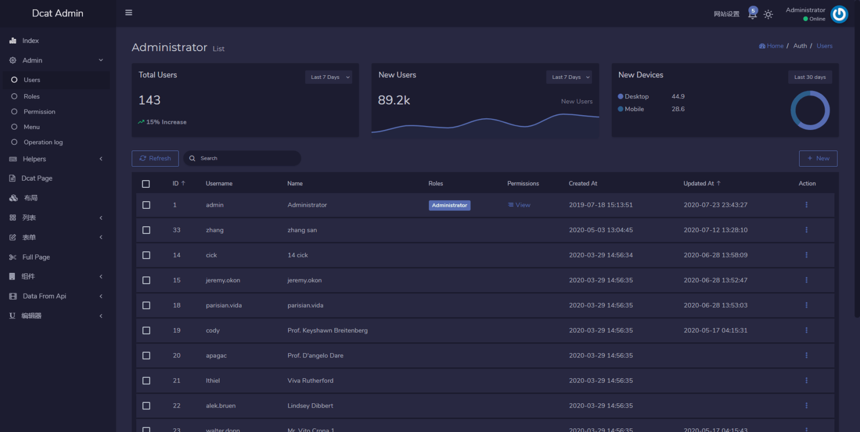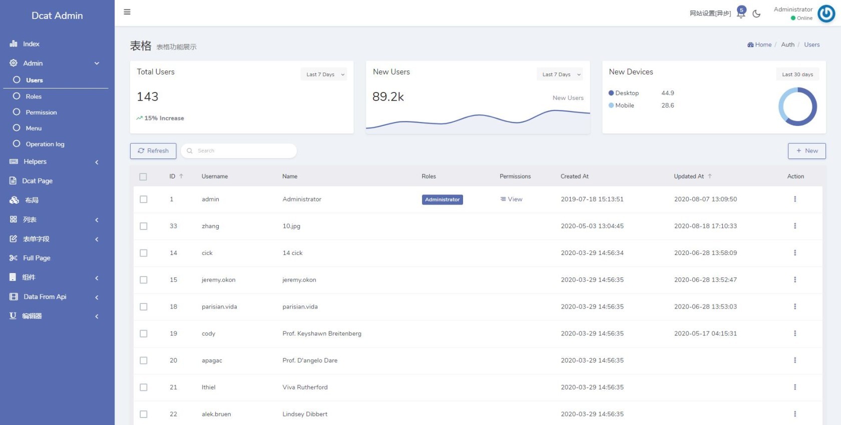 Dcat Admin是一个基于laravel-admin二次开发而成的后台系统构建工具,只需很少的代码即可快速构建出一个功能完善的高颜值后台系统。支持页面一键生成CURD代码,内置丰富的后台常用组件,开箱即用,让开发者告别冗杂的HTML代码,对后端开发者非常友好。