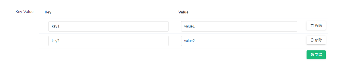 $form->keyValue(...)->setKeyLabel('键名')->setValueLabel('键值');也可以自定义默认结构,以便于新建数据时候自动带入 keyValue 数据的模板
