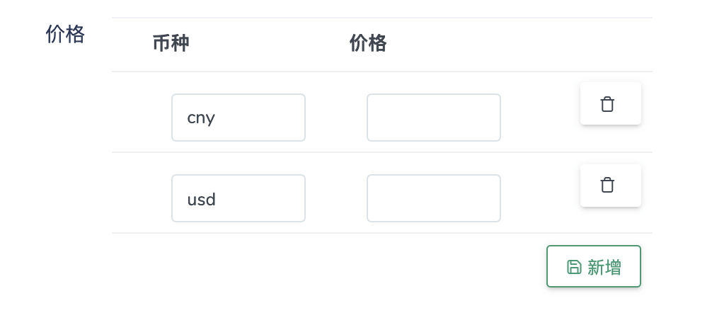 $form->keyValue('price')->default(['cny' => '', 'usd' => ''])->setKeyLabel('币种')->setValueLabel('价格');